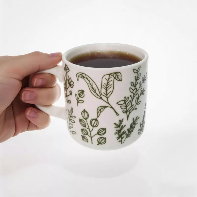 1. اس پیالا میں اس کے بصری مرکز کے طور پر ایک سادہ اور قدرتی سبز بوٹینیکل پرنٹ شامل ہے: